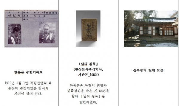 아울러 1926년 민족의 희망을 노래한 시들을 모아 『님의 침묵』이라는 시집을 발간하고 시와 소설 등 많은 문학작품을 통해 그의 민족정신을 구현하였는데, 이로써 한용운은 한국문학사에서 대표적인 근대시인이자 저항시인으로 평가받고 있다.