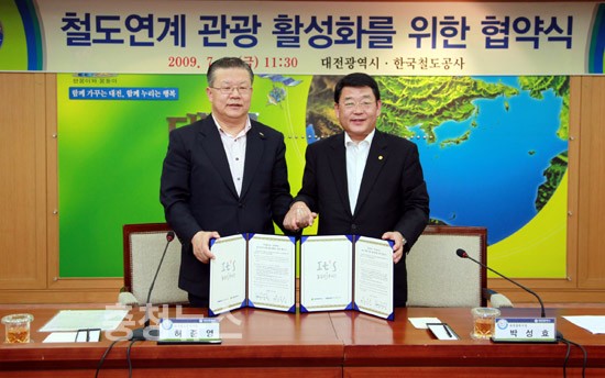 이날 박성효 대전시장은 “KORAIL과의 협력은 내년 충청권 방문의 해와 더불어 대전 관광의 대 전환점을 마련, 지역경제 활성화 초석을 마련하는 계기가 될 것으로 본다”고 말했다.