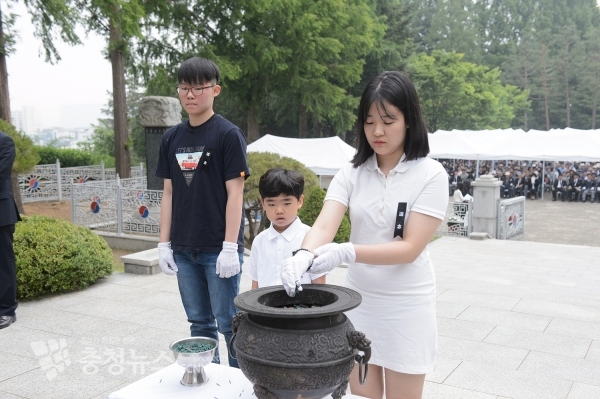 이날 추념식은 이춘희 시장, 김중로 국회의원, 서금택 세종시의회 의장, 김정환 세종경찰서장과 상이군경회·전몰군경유족회 세종지회 등 8개 보훈단체장 및 보훈가족 등 1,000여 명이 참가한 가운데 엄수됐다.