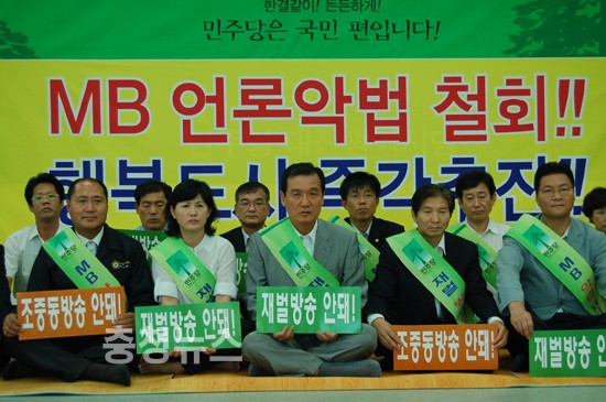 “국민 대다수가 반대하는 언론악법 즉각 철회하고, 충청인의 염원인 행복도시를 즉각 추진하라!”
