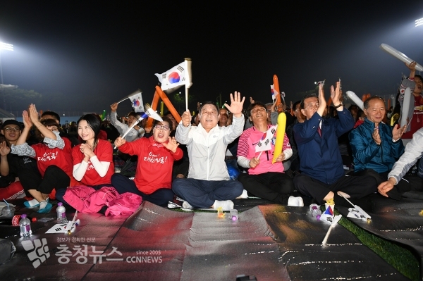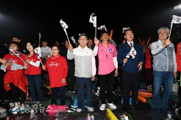 16일 자정부터 예산종합운동장 주경기장에서 열린 ‘이광연 선수 거리응원’에 홍문표 국회의원, 황선봉 예산군수를 비롯한 이광연 선수의 할머니와 부모님, 군민, 군청직원 등 2000여 명의 함성과 환호가 가득 찼다.