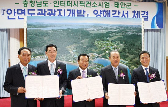충남도는 28일 오후 도청 대회의실에서 인터퍼시픽컨소시엄 이만규 대표, 에머슨퍼시픽그룹 이중명 회장, 진태구 태안군수와 안면도관광지개발을 위한 양해각서를 체결했다.