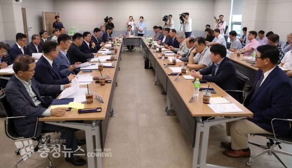 양승조 지사를 비롯한 도 관계 실·국장 등은 30일 공주시 솔브레인에서 관련 업체 관계자 등 30여명이 참석한 가운데, ‘경제 상황판단 및 현장 간담회’를 개최했다.