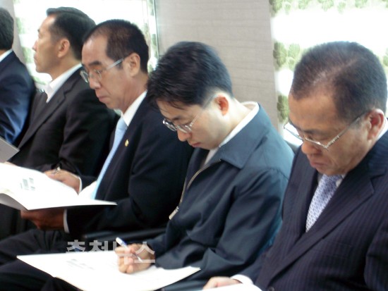민주당과 자유선진당 지도가 9일 오전 행복도시건설청을 방문하고 충청권 최대 이슈에 대한 선점 잡기에 경쟁적으로 나섰다.