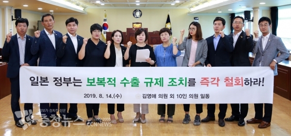 김영애의원 외 10인 의원일동은 “일제 강제침탈에 대한 반성없이 경제침략으로 도발하는 동시에 양국관계를 악화 일로로 몰아가고 있는 일본 아베정권의 행위를 강력히 규탄하는 바이며, 34만 아산시민의 뜻을 모아 수출규제 강화조치를 즉각 철회할 것을 촉구하며 피해자들에게 정당한 배상지급과 함께 일본정부의 진정한 사과와 경제보복 조치의 철회가 이루어질 때까지 일본여행과 일본에서 수입되는 상품구매를 자제할 것이다”라고 성명을 발표했다.