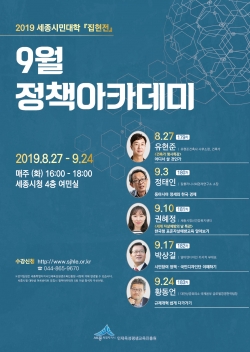 세종시(시장 이춘희)가 27일부터 다음달 24일까지 매주 화요일 오후 4시 시청 여민실에서 건축 및 동아시아 정세 등 이슈를 반영한 다양한 주제로 9월 정책아카데미 강연을 진행한다.