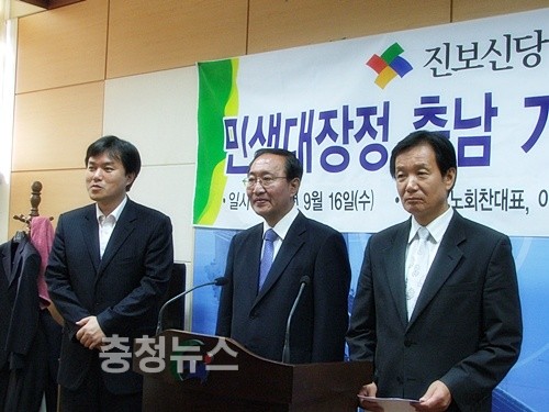 진보신당 노회찬 대표가 16일 충남도청에서 기자간담회를 갖고 최근 논란의 중심에 있는 세종시 건설사업 원안 추진에 대한 강경한 입장을 밝혔다.