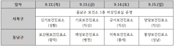 동남구보건소는 4일 동안 비상진료실을 운영하고, 12일에는 신가보건진료소(성환), 보산원보건진료소(광덕)에서 진료를 받을 수 있다.