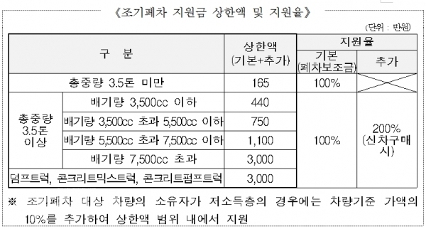 지원 규모는 3.5톤 미만 차량은 최대 165만 원, 3.5톤 이상 및 건설기계 3종은 추가 지원금 포함 시 최대 3000만 원까지 지원된다.
