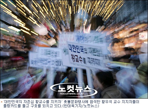황우석 교수를 지지하는 촛불은 주일에도 꺼지지 않았다. 14일 오후 서울 광화문 동화면세점 앞에서 열린 황우석 교수를 지지하는 촛불문화행사에는 인터넷 까페 회원 등 시민 1천500여 명이 참석해 황 교수의 연구 재개를 요구했다. 이들은 이 자리에서 "황우석 교수를 둘러싼 모든 의혹이 가려지고 황 교수의 연구가 재개돼 줄기세포 원천 기술을 지켜내야 한다"며 "서울대 정운찬 총장이 모든 책임을 지고 사퇴할 것"을 주장했다. 이 자리에는 한국척수장애인협회 회원들이 휠체어를 탄 채 참석하기도 했으며 황 교수의 얼굴이 새겨진 티셔츠를 맞춰입은 참가자들의 모습도 눈에 띄었다.