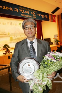 ※사진설명 : 자치구 승격 20주년을 맞아 지난 10일 서구청 2층 대강당에서 가진 서구민의 날 행사에서 자랑스런 서구인상을 받은 연극인 이종국씨와 유복미 복수동 새마을부녀회장 그리고 대전충남 생태보전시민모임
