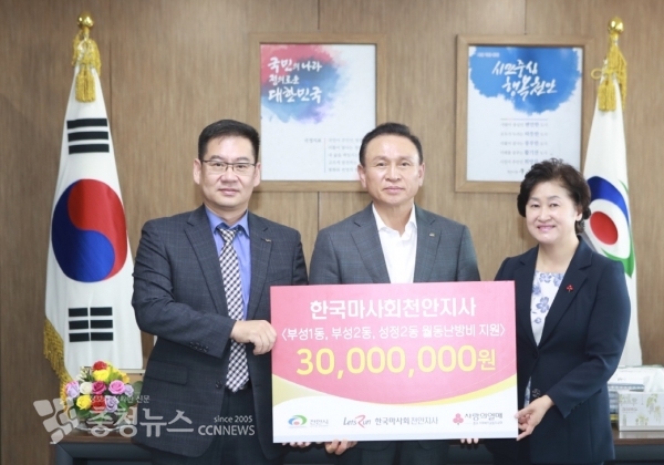 이 날 전달된 3천만원의 성금은 천안시 부성1동, 부성2동, 성정2동의 저소득 계층에게 월동난방비를 지원하여 따뜻한 겨울을 보낼 수 있도록 지원될 예정이다.