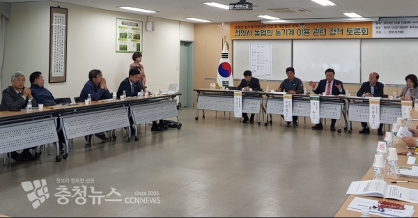 천안시의회(의장 인치견) 의원들로 구성된 ‘천안시의회 농기계임대사업 합리화 의정연구회’(허욱 의원, 안미희 의원, 김철환 의원, 육종영 의원)은 15일 천안시농업기술센터 회의실에서 ‘천안시 농업인 농기계 이용 관련 정책토론회’를 개최했다.