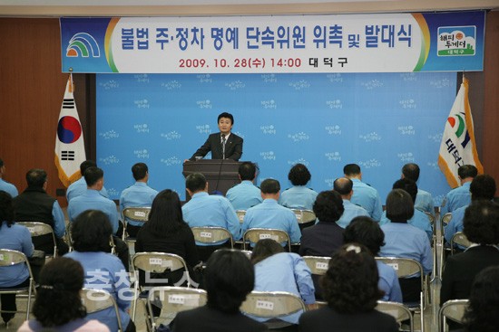 대전 대덕구(구청장 정용기)는 28일 구청 중회의실에서 관내 모범운전자회와 녹색어머니회, 곰두리봉사회, 지역주민 등 73명에 대해 ‘불법 주 ․ 정차 명예단속위원’으로 위촉하고 캠페인을 전개했다.