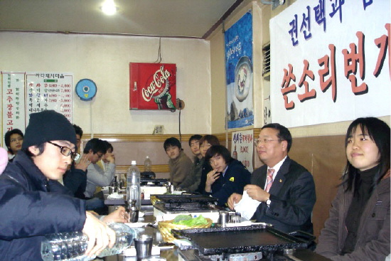 시장 출마를 앞두고 지역 젊은이들의 고민을 듣고 이를 정책에 반영하기 위해 마련된 이날 번개모임에는 인터넷 게시판을 통해 소식을 접한 대학생 및 졸업생들 50여 명이 참석한 가운데 진행됐다.