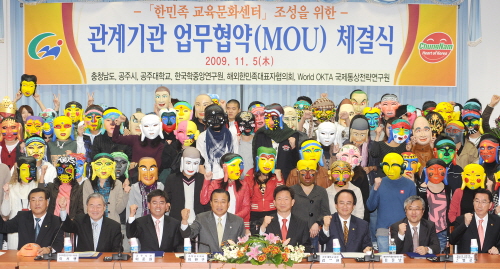 이완구 충남지사는 5일 오전 소회의실에서 공주시와 공주대학교, 국립국제교육원, 한국학중앙연구원 Word OKTA 국제통상전략연구원 등 6개 기관이 참석한 가운데 한민족교육문화센터 조성 사업 추진에 관한 협약을 체결했다.