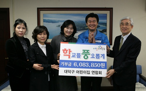 대덕구어린이집연합회(국공립회장 정진숙)는 13일 구청 구민의 사랑방에서 대덕구(구청장 정용기) 학풍추진위원회에 학풍 캠페인 기부금으로 608만원을 전달했다. 대덕구어린이집연합회는 관내 어린이집 188개소가 소속돼 있으며 2007년에도 학풍저금통을 모으는 등 현재까지 2000만원을 기부했다. 저작권자 © 충청뉴스 무단전재 및 재배포 금지 성재은 기자 다른기사 보기 기사가 마음에 드셨나요? 충청뉴스 좋은 기사 후원하기 1,000원 3,000원 5,000원 10,000원 30,000원 50,000원 직접입력 비회원 약관동의하기 ※ 소중한 후원금은 더 좋은 기사를 만드는데 쓰겠습니다.