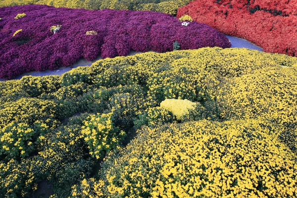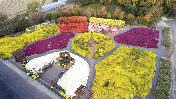 국화동산에는 금방울(노랑), 버닝볼(빨강), 도화블(분홍), 프리티볼(주황), 상아볼(흰색) 등 5종, 1만 송이가 만개해 가을의 장관을 연출하고 있다.