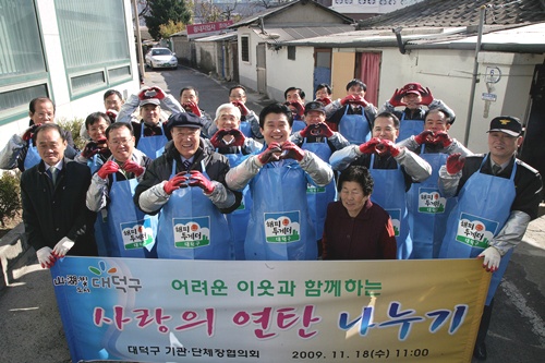 이날 행사는 김형태 한남대학교총장, 이자하 대덕경찰서장 등 20명의 대덕구 기관단체장들이 11월 협의회 모금회비로 연탄 1000장을 마련해 연탄을 이웃에게 전달했다.