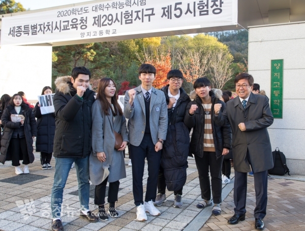2020학년도 대학수학능력시험이 치러진 14일 오전 세종시 양지고 앞에서 최교진 세종시교육감이 수험생들과 함께 화이팅을 외치고 있다. 저작권자 © 충청뉴스 무단전재 및 재배포 금지 최형순 기자 다른기사 보기 기사가 마음에 드셨나요? 충청뉴스 좋은 기사 후원하기 1,000원 3,000원 5,000원 10,000원 30,000원 50,000원 직접입력 비회원 약관동의하기 ※ 소중한 후원금은 더 좋은 기사를 만드는데 쓰겠습니다.