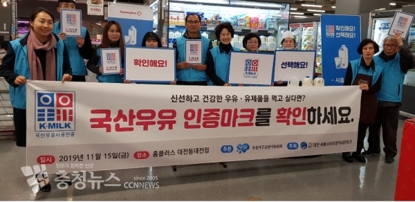 (사)대전세종소비자공익네트워크(회장 도정자)는 15일 대전 용전동에 위치한 홈플러스 동대전점과 함께 국산우유 사용인증마크의 인지도 제고를 위한 “K-MILK를 확인하세요” 공동 홍보 캠페인을 전개했다.