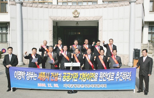 전국의 비수도권 13개 광역의회 의장과 혁신도시 및 기업도시가 들어설 12개 기초의회 의원들이 세종시(행정중심복합도시)와 공공기관 지방이전의 원안추진을 촉구하고 나섰다. 지역균형발전광역의회협의회(회장 강태봉 충남도의회 의장)와 지역균형발전기초의회협의회(장상수 대구 동구회의 의장)는 26일 충남도의회에서 '세종시 및 공공기관 지방이전 원안추진 촉구대회'를 가졌다.