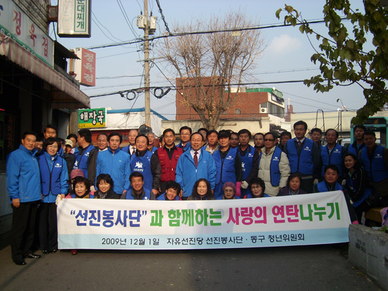 자유선진당 대전광역시당 선진봉사회(회장 이응노)와 동구당원협의회 청년위원회(위원장 남진근)는 연탄 1,000장을 대전연탄은행에 기탁하여 12월 1일(화) 오후 2시 동구 중앙동ㆍ대동 일대 독거노인 및 경제적 어려움을 겪고 있는 7세대 가정에 연탄 1,000장을 배달하는 봉사활동을 펼쳤다.