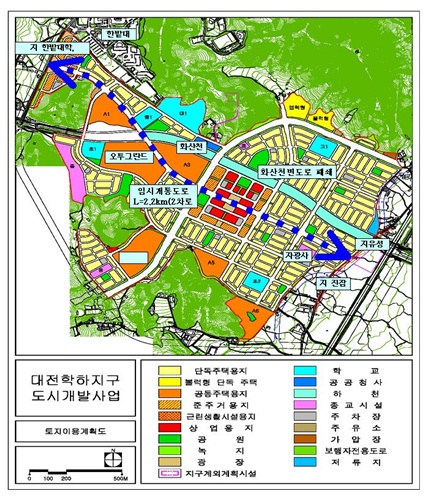 시는 오는 14일 2011년 말까지 완료 예정으로 추진중인 학하 도시개발사업지구내 수통골, 한밭대학교 현충원 방향으로 통행하는 기존 제방도로를 전면폐쇄하고 왕복4차로 중 2차로 2.2km을 우선 개통해 시민들의 교통편의를 제공한다.