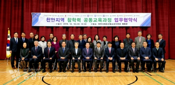 교육청은 18일 천안태조산청소년수련원에서 천안시, 공주대학교, 나사렛대학교, 남서울대학교, 단국대학교, 백석대학교, 백석문화대학교, 상명대학교, 선문대학교, 연암대학교, 한국기술교육대학교, 호서대학교와 참학력 공동교육과정 업무 협약식을 가졌다.