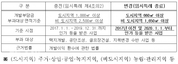 임시특례에 따라 2017년부터 3년간 개발부담금 부과대상 면적은 세종특별자치시의 경우 도시지역은 660㎡에서 1,000㎡이상으로, 비도시지역은 1,650㎡에서 2,500㎡이상으로 완화 운영되어왔다.