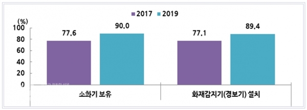 세종시민의 심폐소생술 시행가능 비율은 42.0%로 나타났으며, 가구 내 주택용 소방시설 설치현황은 ‘소화기 보유’가 90.0%, ‘화재감지기(경보기) 설치’가 89.4%로 2017년에 비해 모두 상승했다.