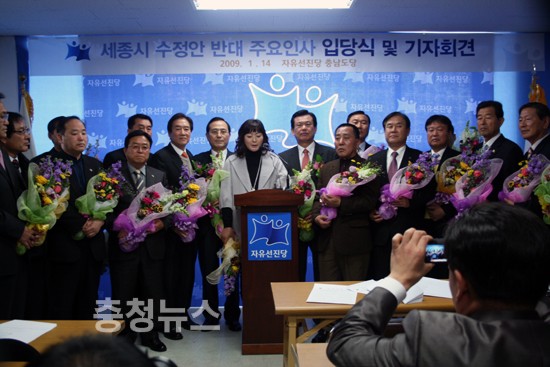 오 전 국회의원과 15명 입당자들은 입당식에 이어 기자회견을 열고 세종시 수정 반대와 결의 및 자신들의 입장과 각오를 밝혔다.