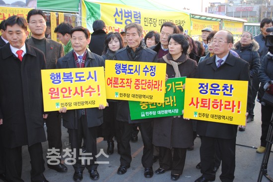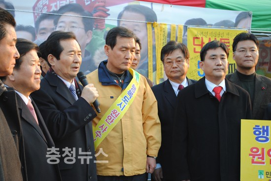 세종시 수정안 저지를 위한 선병렬 시당위원장의 단식 농성장이 마련된 대전역 광장과 김원웅 민주당 전 의원의 삼보일배가 진행중인 둔산동 갤러리아 백화점 앞으로 정세균 민주당대표가 격려방문했다.