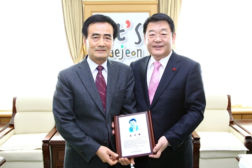 기성동 지역 통장으로 이뤄진 기성동통장협의회 23명은 26일 오전 대전시청으로 박 시장을 예방하고 기성종합복지관 개관 등 주민 복지에 기여한 공로로 감사패를 전달했다.