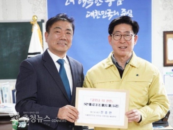 더불어민주당 전종한 천안갑 국회의원 예비후보가 16일 아산에 설치된 충남도지사 임시집무실을 찾아 양승조 도지사와 환담을 나누고, 코로나-19 사태 관련 제안서를 전달했다.