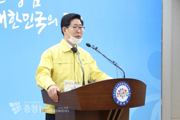양승조 충남도지사는 26일 도청 프레스센터에서 코로나19 추가 확진자 관련 기자회견을 했다.