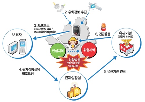 안심지역을 벗어났을 경우 위치정보를 포함한 SOS통보가 보호자에게 문자메시지로 전달되며 보호자는 관제상황실의 협조를 받아 경찰서와 119 등 유관기관의 긴급출동으로 응급상황에 대처할 수 있다.