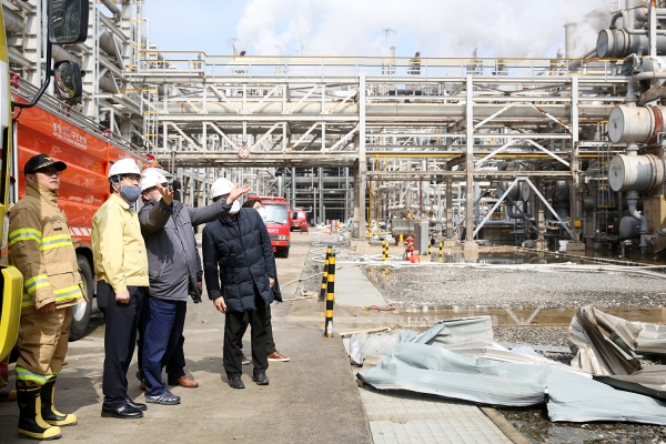 맹정호 서산시장이 롯데케미칼 폭발사고 현장을 찾아 관계자들과 수습방안 및 재발방지대책을 논의하고, 피해를 입은 대산지역 시민들을 위로하고 있다.
