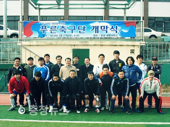 한나라당 대전광역시당(의원장 송병대)의 당직자 50여명으로 구성된 푸른축구단(단장 이장우 동구청장)은 27일(토) 오전 9시 유성 생명과학고등학교 운동장에서 2010년 개막식과 더불어 중도일보 축구단과 함께 친선경기를 펼쳤다.