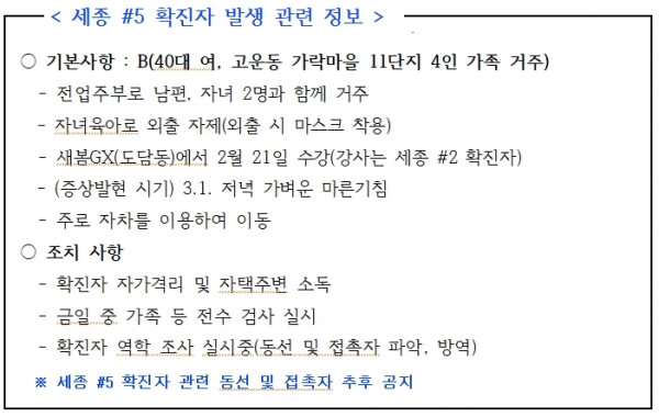 8일 세종시에 따르면 #4번(50대 여성, 새롬동), #5번(40대 여성, 고운동) 모두 도담동 줌바 댄스 수강생이다. 이에 따라 세종 거주 코로나19 환자는 5명으로 늘어났다.