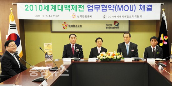 세계대백제전 조직위원회(위원장 최석원) 는 오늘 오전 서울 중구 청계천로 한국관광공사 16층 회의실에서 관광공사 이 참 사장을 비롯한 임직원 등 양측 관계자가 참석한 가운데 상호 업무협력 협약식(MOU)을 갖고 외국 관광객 유치 확대를 위해 공동 노력키로 합의하였다.