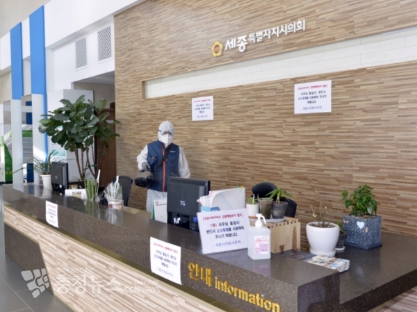 세종시의회 관계자는 “현행 2개월에 1회에서 월 1회 이상 소독 횟수를 늘려 청사 방역체계를 강화함으로써 청사 내 바이러스 감염 사례가 발생되지 않도록 만전을 기하고 있다”고 밝혔다.