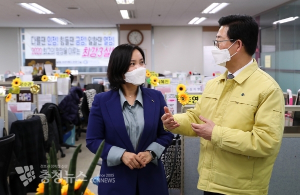 양승조 충남지사가 17일 천안에 소재한 A 카드사 콜센터를 찾아 현장 방역 및 근무상황을 긴급 점검했다.