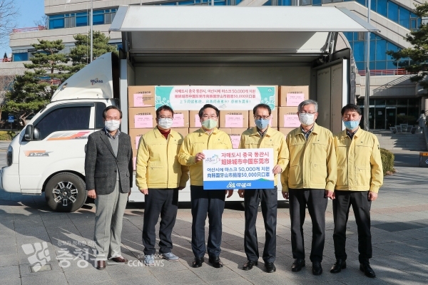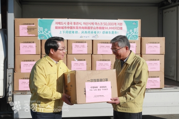 아산시(시장 오세현)가 자매 결연을 맺은 중국 동관시로부터 코로나19 방역을 위한 마스크 5만장을 지원받았다.