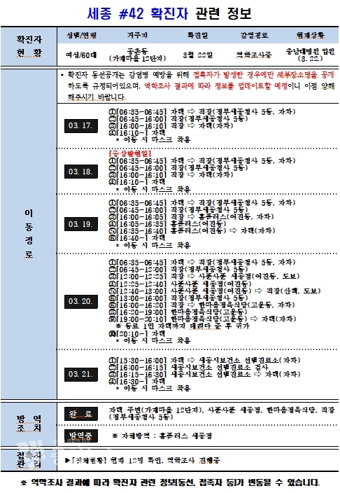 세종시가 22일 코로나19 #42번 확진자의 동선을 공개했다. 다만 밀접접촉 연관이 파악되지 않은 동선은 우선 비공개 했다. 저작권자 © 충청뉴스 무단전재 및 재배포 금지 최형순 기자 다른기사 보기 기사가 마음에 드셨나요? 충청뉴스 좋은 기사 후원하기 1,000원 3,000원 5,000원 10,000원 30,000원 50,000원 직접입력 비회원 약관동의하기 ※ 소중한 후원금은 더 좋은 기사를 만드는데 쓰겠습니다.