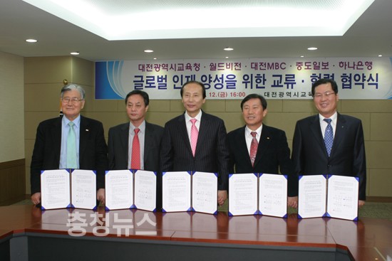 대전시교육청과 대전MBC, 월드비전, 중도일보, 하나은행은 12일 오후 대전광역시교육청에서 글로벌 인재 양성 교육을 활성화하기 위한 업무협약을 체결하였다.