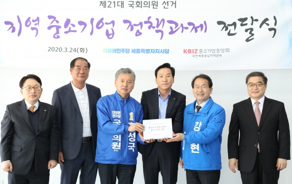 더불어민주당 세종시당이 24일 중소기업중앙회 대전·세종·충남지역본부로부터 총선 정책과제를 전달받았다.