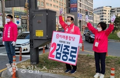 김중로 미래통합당 세종갑 후보는 25일 도담동 인사혁신처 사거리에서 시의원 보권선거에 나오는 김영래 후보와 퇴근길 인사를 하며 지지를 호소했다.
