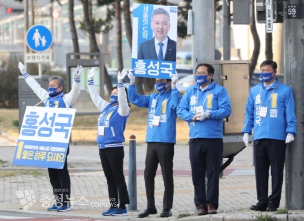 더불어민주당 홍성국 후보는 시외버스터미날 사거리에서 "오직 국민을 생각하고, 더 나은 대한민국의 미래, 세종의 도약을 위해 열심히 뛰어 꼭 선거에서 압승하겠다”고 다짐했다.