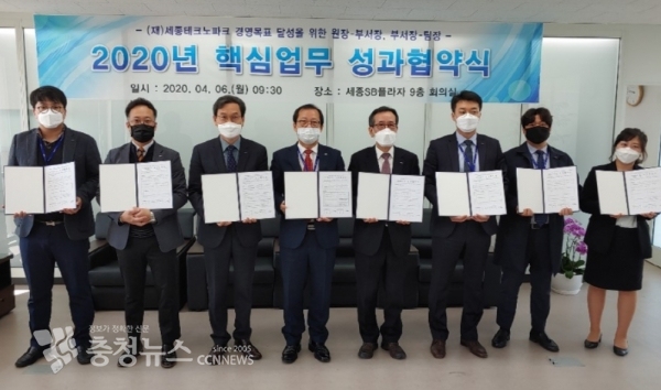 (재)세종테크노파크는 4월 6일 김현태 원장과 관리자급 직원이 참석한 가운데 책임경영 구현을 위한 2020년 핵심업무 성과협약을 체결했다.